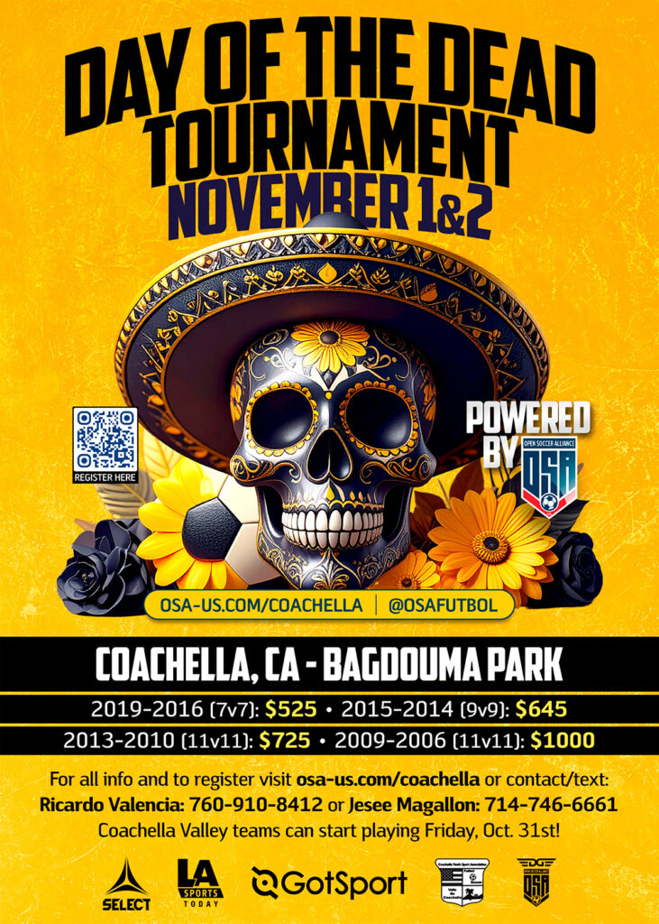 Get ready for a celebration of fútbol and culture like no other! The Day of the Dead Tournament is coming to Coachella on November 1st & 2nd at Bagdouma Park — where passion, tradition, and competition collide!